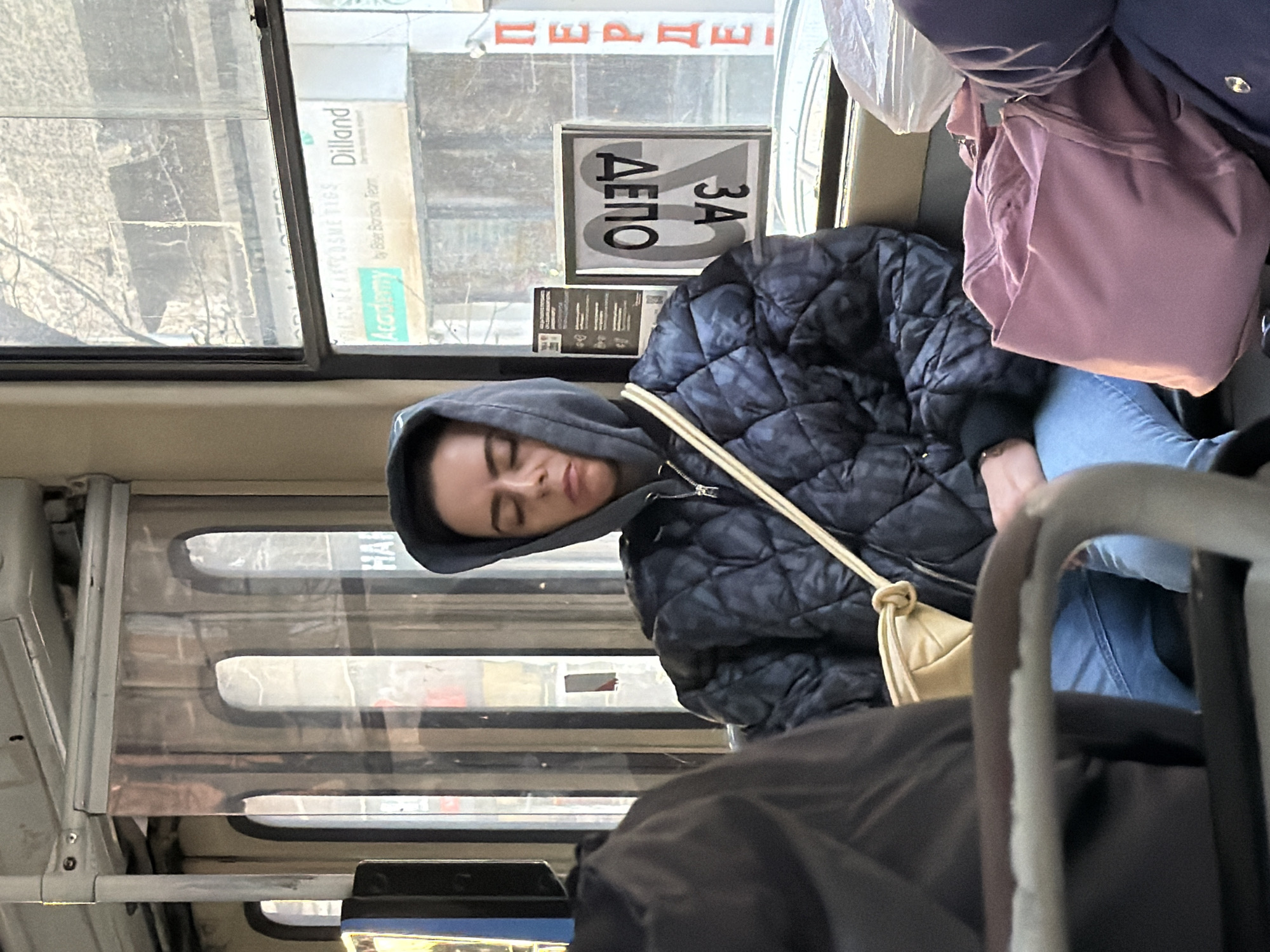 An interior view of a public transport vehicle, likely a tram or bus, shows passengers during daylight. The location is identified as Sofia, Bulgaria, based on storefront signs visible through the window, which display "Academy by Biser Borisov Team" and "Dilland," alongside Cyrillic text including "ПЕРДЕ" and a reversed "ОЦЕП ЗА" on an interior placard. A female individual is seated centrally, her eyes closed, indicating a state of rest or sleep. She is dressed in a dark grey hooded sweatshirt, a black quilted jacket, and light blue jeans. A light yellow cross-body bag with a knotted strap is worn over her shoulder. To her right, a pink fabric tote bag rests on an adjacent seat, partially covered by a clear plastic bag and the dark-trousered leg of another passenger. A blurred dark garment belonging to an unidentified person is visible in the foreground to her left. The vehicle's interior features a light-colored ceiling panel, a vertical support pole, and transparent partitioning. Information placards, including one with QR codes and text, are affixed near the window. The exterior view through the window reveals urban buildings, bare tree branches, and additional storefront signage.
