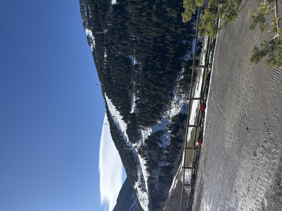 A view from a dirt road looking up a mountainside in Soldeu, Andorra. The mountainside is covered in snow and evergreen trees. There are power lines running up the mountain. There is a wooden fence at the edge of the road. There are two red objects visible in the distance. The sky is blue with a few clouds. The sun is shining.