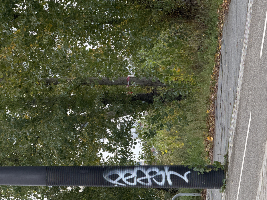 This image presents a static, outdoor scene located within the city of Strasbourg, France, likely during the autumn season. In the immediate foreground on the left, a dark grey, fluted utility pole stands vertically. Its lower section is marked with white spray-painted graffiti, depicting an abstract, interwoven design. A small green plant grows vertically along the pole's base. To the right of the pole, the ground surface consists of an asphalt road section with a continuous white line, bordered by a light grey cobblestone-patterned strip. Beyond this paved area, the ground transitions to dirt covered with fallen brown and yellow leaves, leading into dense vegetation. The midground and background are dominated by an array of deciduous trees and shrubs exhibiting primarily green foliage with some yellowing, indicating the seasonal change. A prominent tree trunk in the mid-right features a segment wrapped with red and white striped tape. Partially visible through the foliage in the upper midground is a light-colored, possibly white, building structure. On the far left, a grey, U-shaped metal object, consistent with a bicycle rack, is partially visible. No individuals or active subjects are present in the scene.