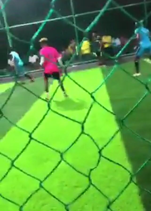 A soccer game is in progress on a green field covered by a net. A player wearing a pink jersey with the number 5 is trying to block a shot while sliding on the ground. Another player in a blue jersey is trying to kick the ball. An arm is visible holding onto the net.