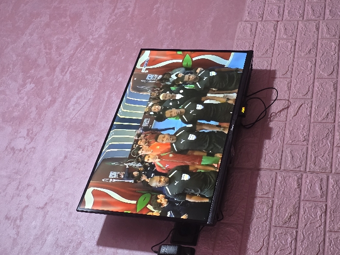 A flat-screen TV is mounted on a wall with a pink, textured surface on the right and a light pink, mottled surface on the left. The TV is displaying a scene with many people wearing similar black shirts with a white logo. Red and green elements are visible in the background, possibly flags or decorative items. Power cords are connected to the TV and routed down the wall.