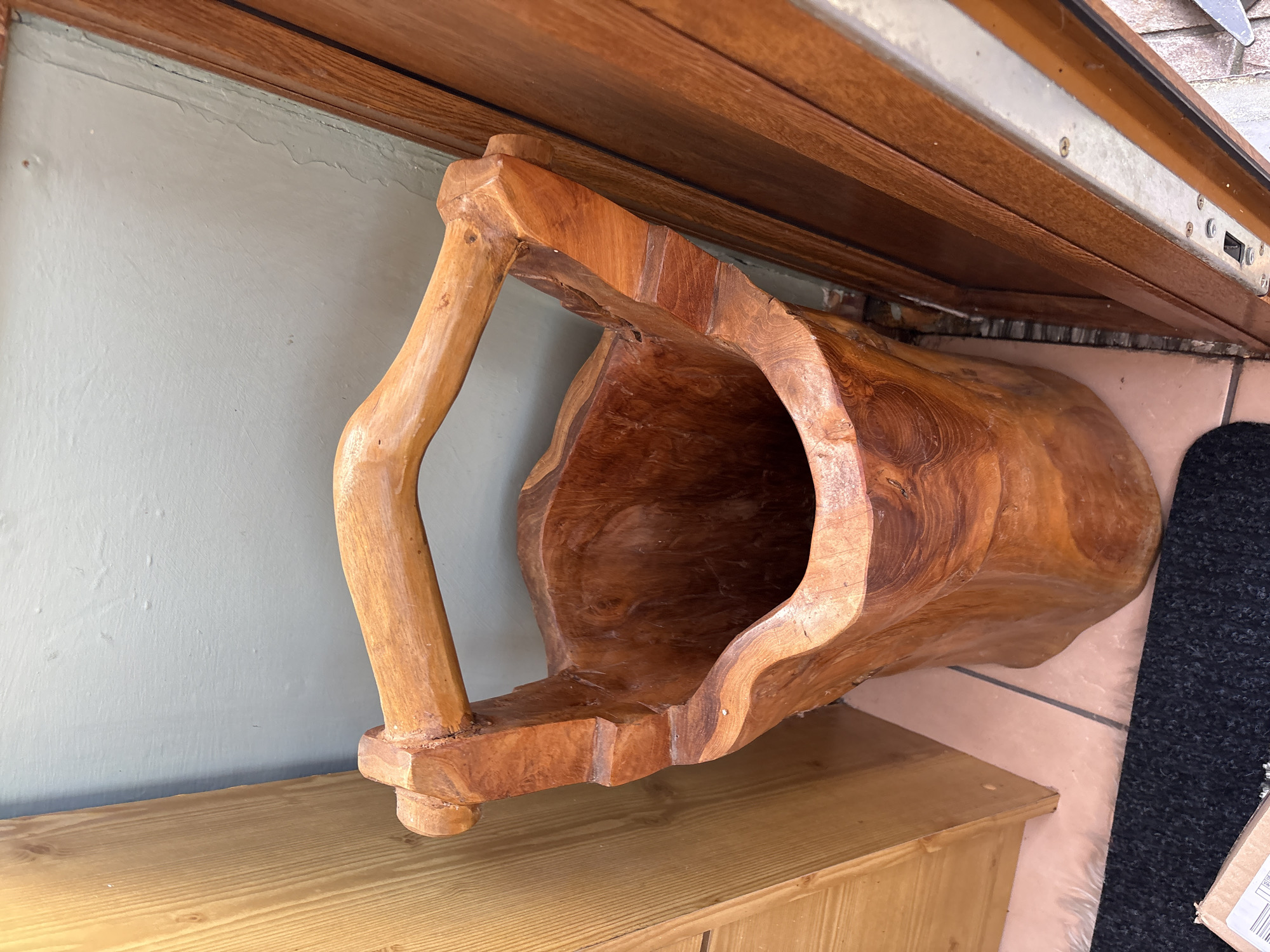 A close-up shot shows a handcrafted wooden container with a handle, possibly a decorative or functional piece, resting on a wooden surface or piece of furniture. The surface it's resting on appears to be another piece of furniture, possibly a cabinet or shelf. The lighting is natural. A tiled floor and dark rug can be seen in the background. The image was taken indoors. It is not possible to confirm its location in the city of Minsterley.