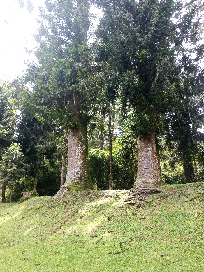 The image presents a natural, outdoor scene located in Serchhip, India. The foreground consists of a gently sloping grassy area, covered in short, bright green vegetation. Dappled sunlight creates distinct patterns of light and shadow across the grass. Numerous dark, exposed tree roots are visible traversing the surface of the slope. In the midground, two large, mature trees stand prominently. Their thick, light-colored trunks display textured bark, with patches of moss or lichen. The canopies of these trees are densely packed with dark green foliage, extending upwards and outwards. Behind these central trees, a dense forest occupies the background, characterized by numerous tree trunks and a thick canopy of leaves, with bright sunlight filtering through. No individuals, artificial structures, or discernible actions are present within the frame.
