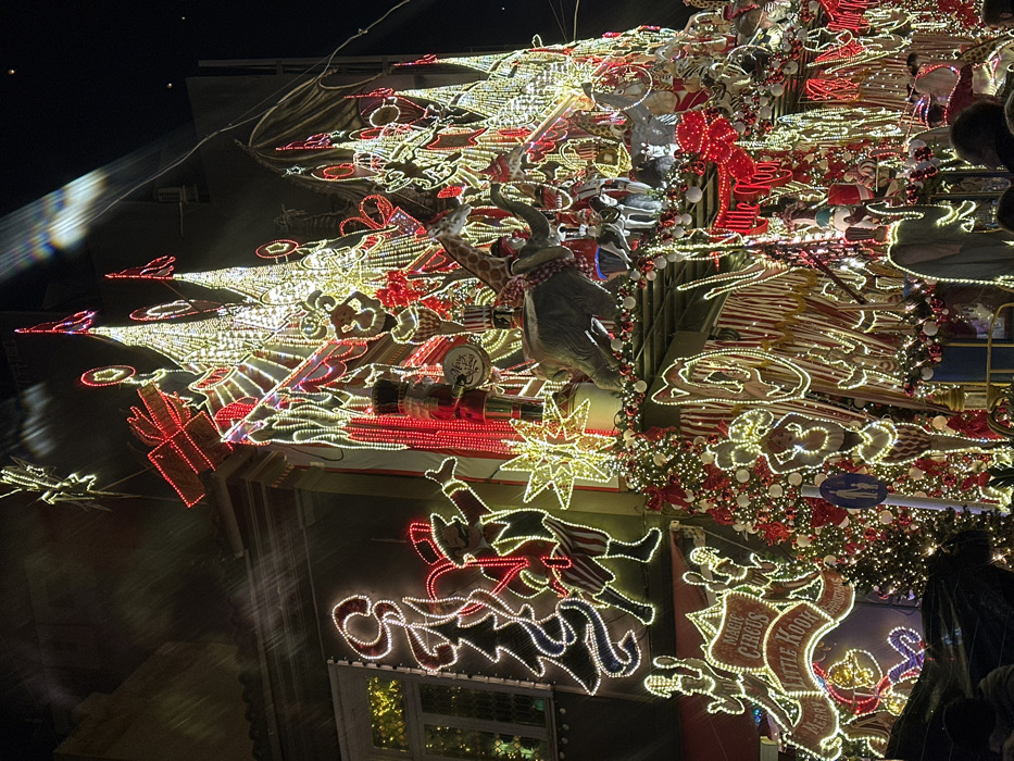 A building facade is heavily decorated with lights and figures for Christmas