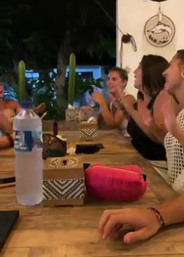group of five or six people sitting around a wooden table outdoors at night, possibly in a restaurant or bar setting. The women on one side of the table are clapping and seem to be enjoying themselves. There is a water bottle, a small pink bag, cell phones, and some decorative boxes on the table. The background includes green plants and wall decorations in a tropical style. The lighting is relatively dim, creating a relaxed atmosphere.