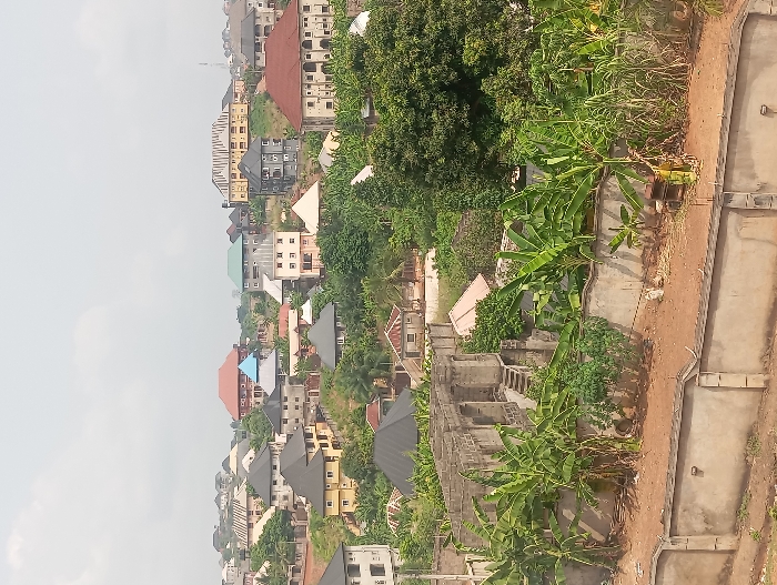 The image displays an elevated view of a residential area in Onitsha, Nigeria, under an overcast sky. The foreground features a concrete retaining wall with an uneven top, behind which lies exposed reddish-brown earth and dense vegetation, including numerous large banana plants, sugarcane, and other trees. Immediately behind the wall, a two-story concrete building is under construction, exhibiting exposed rebar, visible stairwells, and incomplete block walls. The midground and background consist of a densely packed urban landscape characterized by numerous residential buildings scattered across undulating terrain. These structures are predominantly multi-story (two to three levels) with pitched roofs of various colors, including red, green, blue, gray, and brown. Building facades are painted in a range of light colors such as yellow, white, and beige. Extensive greenery and trees are interspersed among the buildings, indicating a blend of urban development and natural growth. Some structures appear complete, while others exhibit characteristics of ongoing construction or partial completion, such as unfinished roofs or exposed concrete frames. A tall, thin structure, possibly a communication tower, is faintly visible on the distant horizon to the right. No individuals, discernible actions, or interactions are visible within the frame.