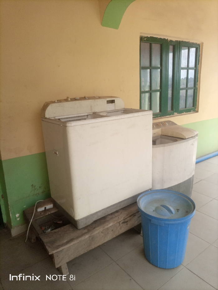 The scene, located in Zango-ndaji, Nigeria, depicts an indoor utility area. A cream-colored, top-loading twin-tub washing machine, exhibiting visible wear and dust on its control panel, rests on a rudimentary wooden platform. To its immediate right, a smaller, grey and white top-loading washing machine is partially visible. The background wall features a light yellow upper section and a green lower section, with the green portion on the left exhibiting minor discoloration. A multi-pane window with dark green frames is set into the wall on the right. An electrical outlet with an attached white cord is visible on the lower left wall, near the wooden platform. A ribbed blue plastic bucket with a matching lid sits on the light grey tiled floor in the lower right. A light blue pipe runs along the base of the wall behind the smaller washing machine. A light green, curved architectural accent is visible in the upper left corner of the wall. No individuals are present.