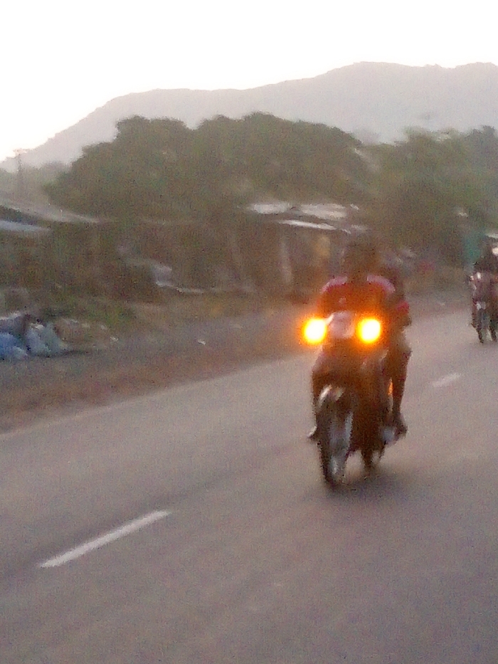 The image depicts a rural or semi-urban road scene in Adankolo, Nigeria, at dusk or dawn. The foreground is dominated by a dark-colored motorcycle moving towards the viewer, featuring two prominently illuminated circular headlights. Two blurred human figures are visible on the motorcycle. A paved road with a single white dashed line running down its center or side occupies the lower half of the frame. In the midground, to the right, another motorcycle with a rider is visible, less distinct. The left side of the midground features indistinct structures, possibly shacks or small buildings, with some piled objects, including what appears to be blue tarpaulin. The background consists of a treeline and hazy, dark mountains or hills under a bright, overcast sky. The overall image exhibits motion blur, particularly on the motorcycles and figures.