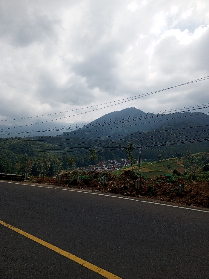 A landscape photograph from Multhan, India, depicts a paved road in the foreground with a solid yellow line marking its left edge. To the immediate right of the road is a dirt and rock embankment, where several short, light-colored posts are partially embedded. Beyond the embankment, a valley unfolds, containing a dense cluster of multi-colored buildings, indicative of a village or small town. These structures are intermingled with green trees and cultivated agricultural fields exhibiting visible terracing. Multiple dark, horizontal wires, consistent with utility lines, traverse the midground above the valley. The background features prominent, dark green, forested mountains rising under a heavily overcast sky filled with varying shades of grey and white clouds. No individuals or specific activities are observable within the scene.