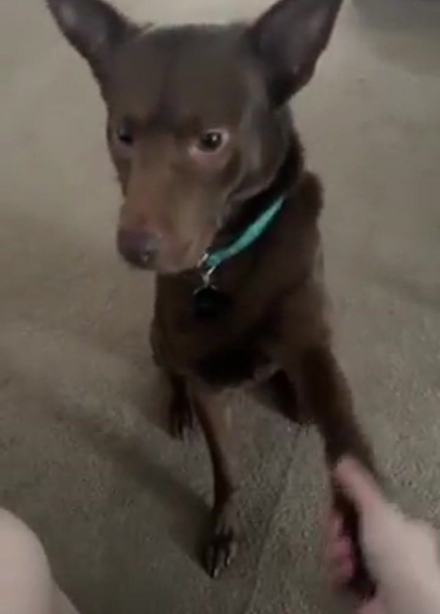 A brown dog with a teal collar is sitting on a beige carpet and offering its paw to a person who is holding it