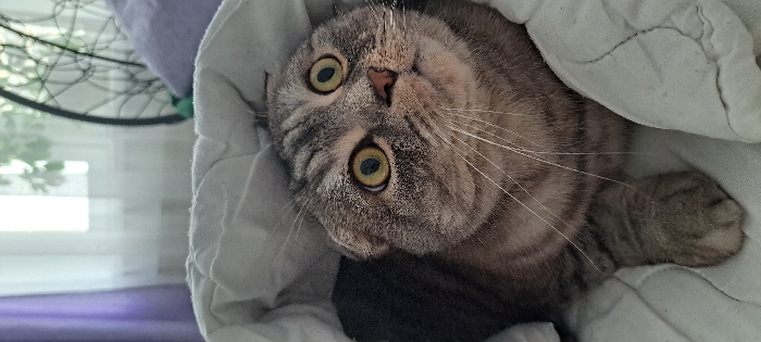 - "A grey tabby Scottish Fold cat, distinguished by its folded ears and striped fur pattern, is positioned in the foreground, partially covered by a white, textured duvet or blanket" by FM-FrnGi2, licensed under CC BY 4.0