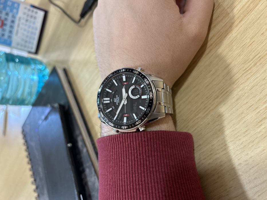 A left forearm and hand, belonging to an unidentified individual, are positioned on a light-colored wooden surface with visible grain. The forearm is covered by a maroon-colored, long-sleeved garment. A silver-toned Casio Edifice analog-digital wristwatch with a black dial and metal link bracelet is worn on the wrist. The watch's digital display indicates "HNL" and "3:02", with "3 ALARMS" also visible. In the background, out of focus, are two stacked dark-colored notebooks, a translucent blue plastic bottle, a white desk calendar, and a black cable. The scene depicts an indoor setting; however, no discernible features within the frame provide evidence to confirm the specified location as Krivina, Bulgaria.