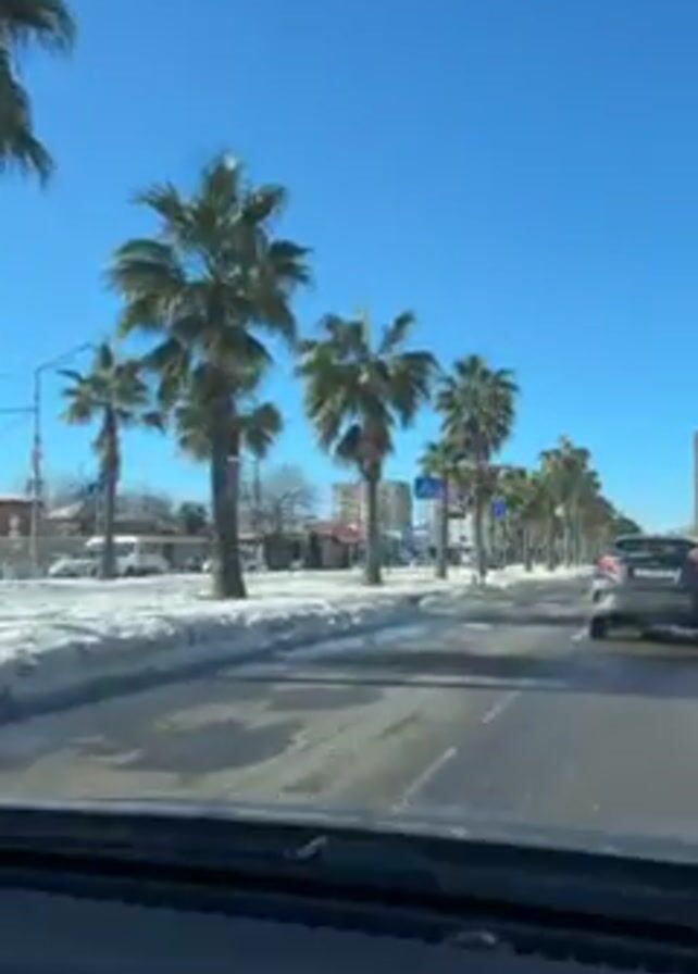 A person is driving down a road on a sunny day. There is snow on the ground on either side of the road, but the road itself is clear. Palm trees line the road on both sides. A gray car is driving ahead of the person. Pedestrian crossing signs are also visible.