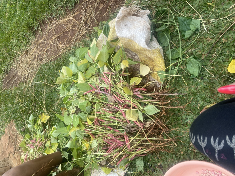 - "A pile of freshly harvested purple string beans with leafy green foliage and exposed roots sits atop a partly full, dirty white burlap sack" by FM-nhoeR2, licensed under CC BY 4.0
