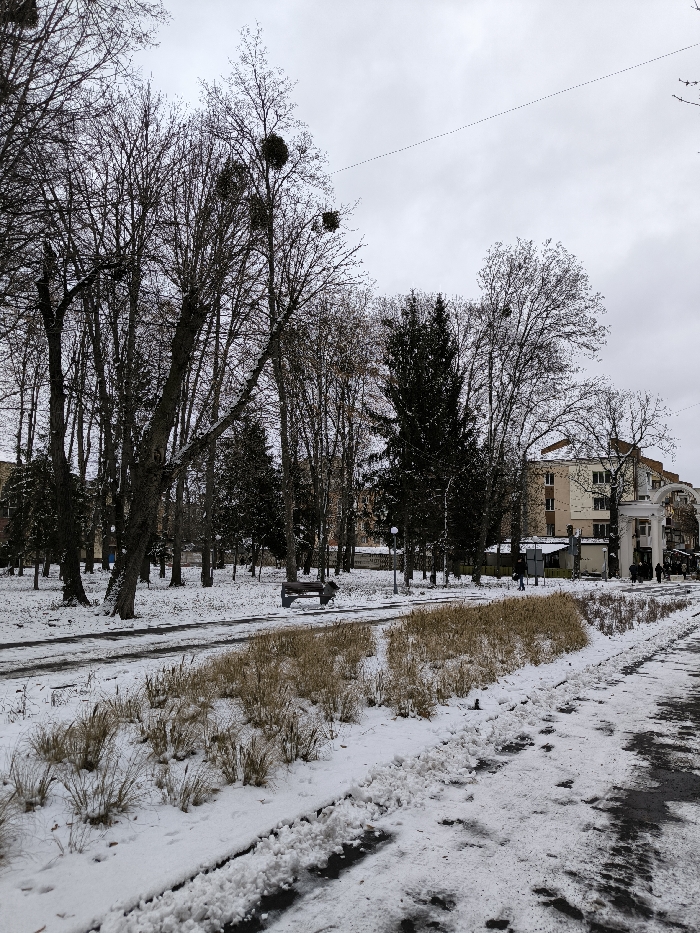 The image depicts a winter scene within Central Park (Park of Culture and Rest) in Vinnytsia, Ukraine, observed from an internal pathway looking towards the park's main entrance or an adjacent urban area. The ground is largely covered in a layer of snow, with patches of visible asphalt or pavement on the right foreground that show tire tracks and footprints. To the left of this, a median strip features snow-covered ground interspersed with clusters of dry, light-brown ornamental grasses or weeds. In the mid-ground, a broad, snow-covered path or alley traverses horizontally, bordered by a park area populated by numerous trees. Most trees are deciduous, bare of leaves, with several prominent examples exhibiting visible clumps of mistletoe in their upper branches. A tall, dark evergreen tree stands prominently in the right-center mid-ground. A wooden park bench is situated on the snow-covered ground to the left of the central path, occupied by a single individual seated, facing away from the camera. In the background, on the right, urban structures are visible. These include a multi-story building with light-colored facades and, most distinctly, a white neoclassical-style entrance structure featuring columns and an archway, likely marking a primary access point to the park or an adjacent building. Several indistinct human figures are walking in the vicinity of these background buildings and the entrance structure. The sky is uniformly overcast and light gray, with faint, thin lines, possibly utility or tram wires, stretched across the upper frame.