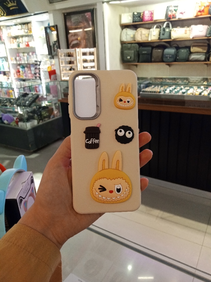 A human hand, visible from the wrist, holds a light beige smartphone case vertically in a retail establishment within Barza Municipality, Syria. The hand, partially covered by a light brown sleeve, grasps the right side of the case. The smartphone case features a rectangular cutout with a silver-colored bezel for a camera module on its upper left. Attached to the case are four raised, colorful appliqués: a small yellow winking bunny head in the top right, a brown "Coffee" cup below it on the left, a black circular character with two white eyes (resembling a Soot Sprite) to the right of the coffee cup, and a larger yellow winking bunny head with a jagged white outline near the bottom. The background shows two distinct retail sections. To the left, shelves filled with various packaged goods, likely cosmetics or personal care items in bottles and containers, are visible within a glass display unit. A blue object is partially visible in the bottom left foreground. To the right, multiple handbags of different colors (including beige, green, and black) are arranged on wooden shelves. Below the handbags, a dark wooden counter with a glass display case contains numerous small, reflective items, consistent with watches or jewelry. The flooring is a light-colored tile reflecting ambient light. The scene is illuminated by overhead indoor lighting.