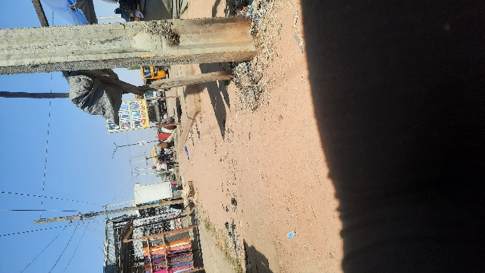 This image depicts a dusty, unpaved street scene in Panshekara, Nigeria, under clear, bright daylight. In the foreground, a large, dark shadow occupies the bottom portion of the frame, indicating the position of the photographer relative to the sun. To the right, a weathered concrete utility pole stands vertically, partially obscured by a dark, bundled object possibly made of tarp or fabric. Debris, including small pieces of litter and gravel, surrounds the base of this pole. The midground features an unpaved road or pathway with visible tire tracks and scattered litter. A raised concrete curb separates the path from what appears to be a market area on the left. On the left side of the image, multiple wooden market stalls display various textiles or clothing items, primarily folded and stacked. Several individuals are visible in the distance, walking along the road or standing near the market stalls. One person wears a light-colored top and dark trousers, another is partially obscured by a stall. Vehicles are present further down the street: a yellow three-wheeled motorized tricycle (commonly known as a Keke Napep in Nigeria) is visible on the right side of the road, and a white pickup truck or cargo vehicle is parked or moving slowly in the center-right. An advertising billboard displaying images of phones or electronics stands prominently near the vehicles. Utility poles with overhead wires crisscross the sky, suggesting an active urban or semi-urban infrastructure. The sky is uniformly clear blue. The overall environment appears to be a bustling, open-air commercial area.