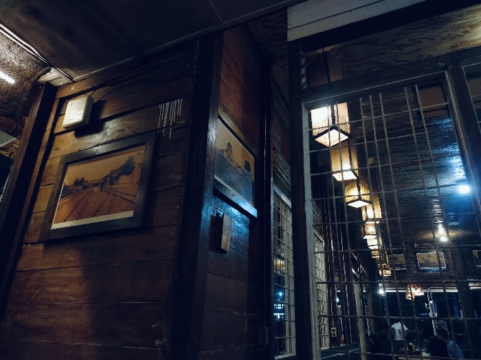 The image depicts a dimly lit interior with wooden walls adorned with framed pictures. A white box is mounted on one wall. To the right, a series of rectangular lights hang from the ceiling, visible through a grid-like structure. People are seated in the background, adding a sense of activity to the dark setting.