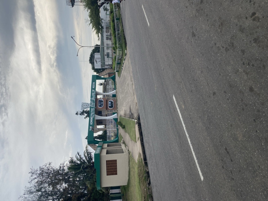 The image displays the main entrance to The Administrative Staff College of Nigeria, located in Tawpo, Nigeria