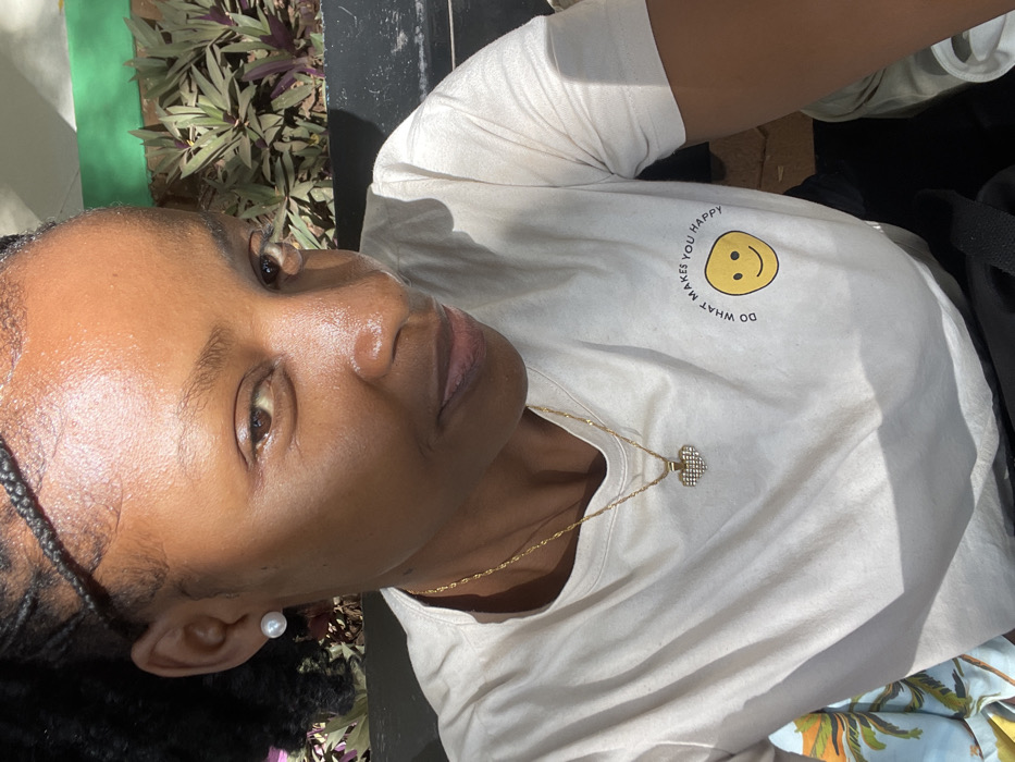 An individual is depicted in a close-up, chest-up portrait shot, positioned outdoors in the Thika Township ward, Kenya. The person, appearing to be female with a dark complexion and dark braided hair, directly faces the camera with a subtle smile. They are wearing a light-colored, short-sleeved t-shirt featuring a yellow smiley face graphic on the left chest area, encircled by the text "DO WHAT MAKES YOU HAPPY". A single white pearl stud earring is visible on the left earlobe. Around the neck, a thin gold-toned chain supports a heart-shaped pendant encrusted with small clear stones. The background, out of focus, reveals green and reddish-purple foliage within a planter or garden bed, with a dark green surface immediately behind the plants. The scene is illuminated by strong, natural sunlight, casting highlights on the subject's skin.