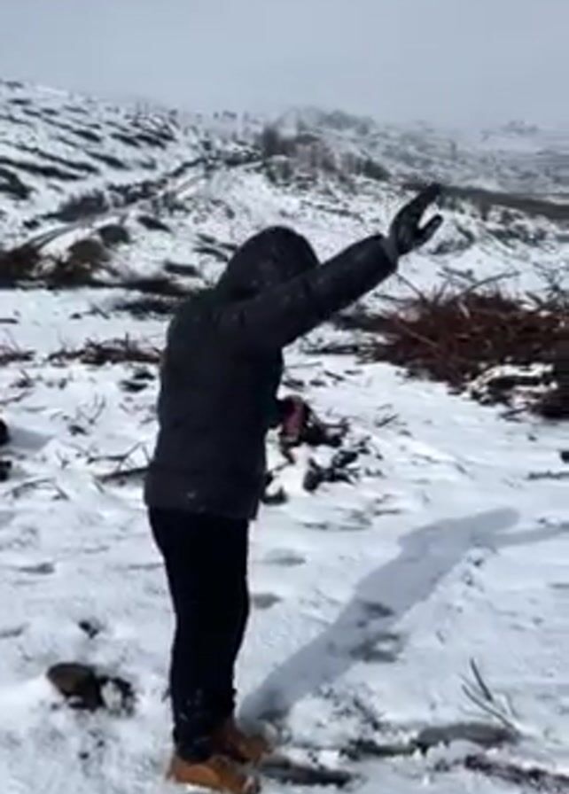 A person wearing a black hooded jacket, black pants, and brown boots is walking and falling in the snow. The person is on a snow-covered hill or mountain with tree branches and debris scattered around. The background consists of a foggy landscape with more snow-covered hills. It appears to be snowing lightly. The person is initially standing, then waving an arm, before slipping and falling in the snow.