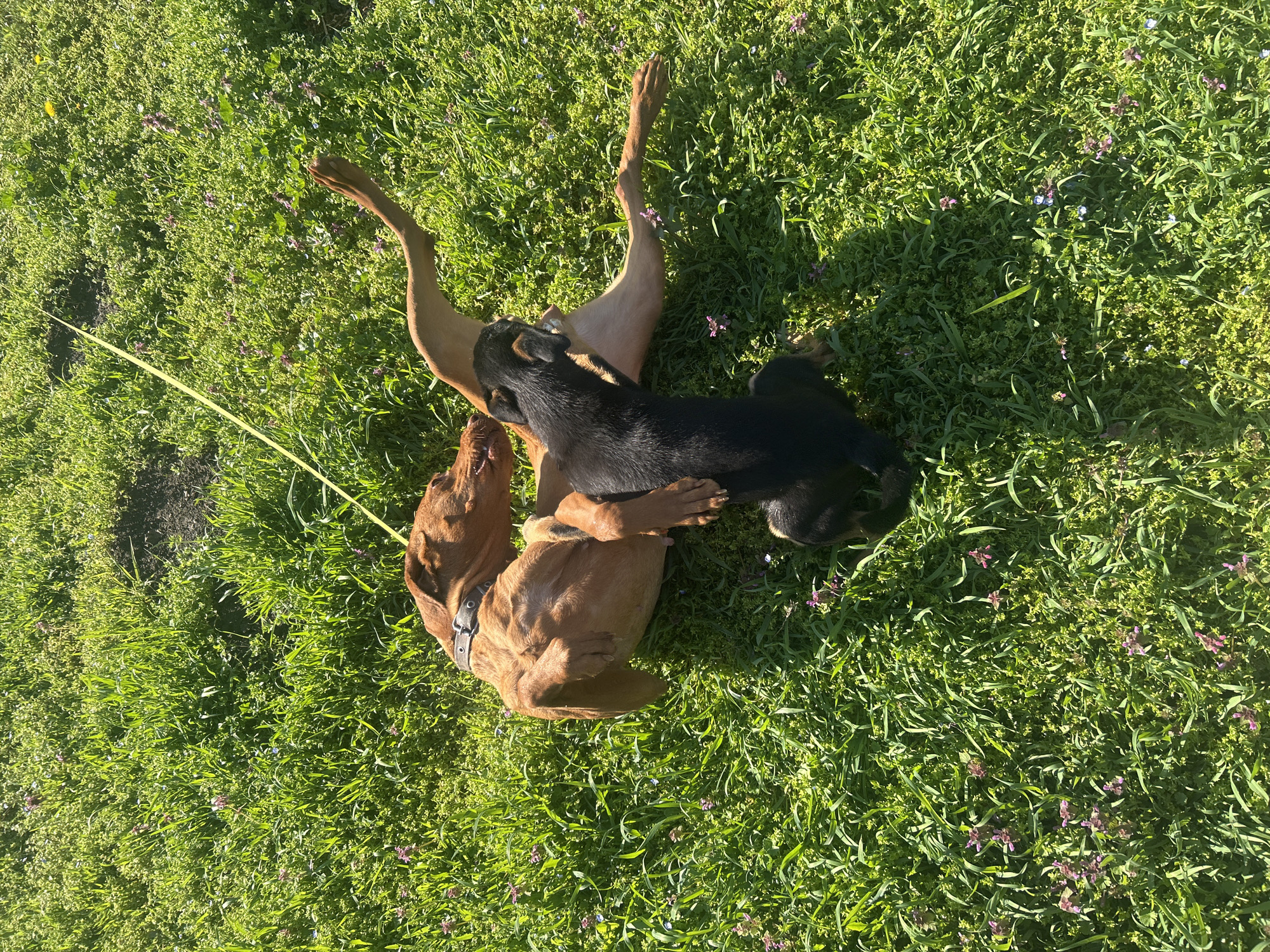 - "Two dogs are playing on a patch of green grass with small purple and white flowers scattered throughout" by FM-h4TRP2, licensed under CC BY 4.0