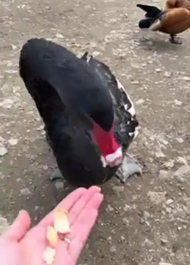 A short video shows a person feeding a black swan pieces of bread