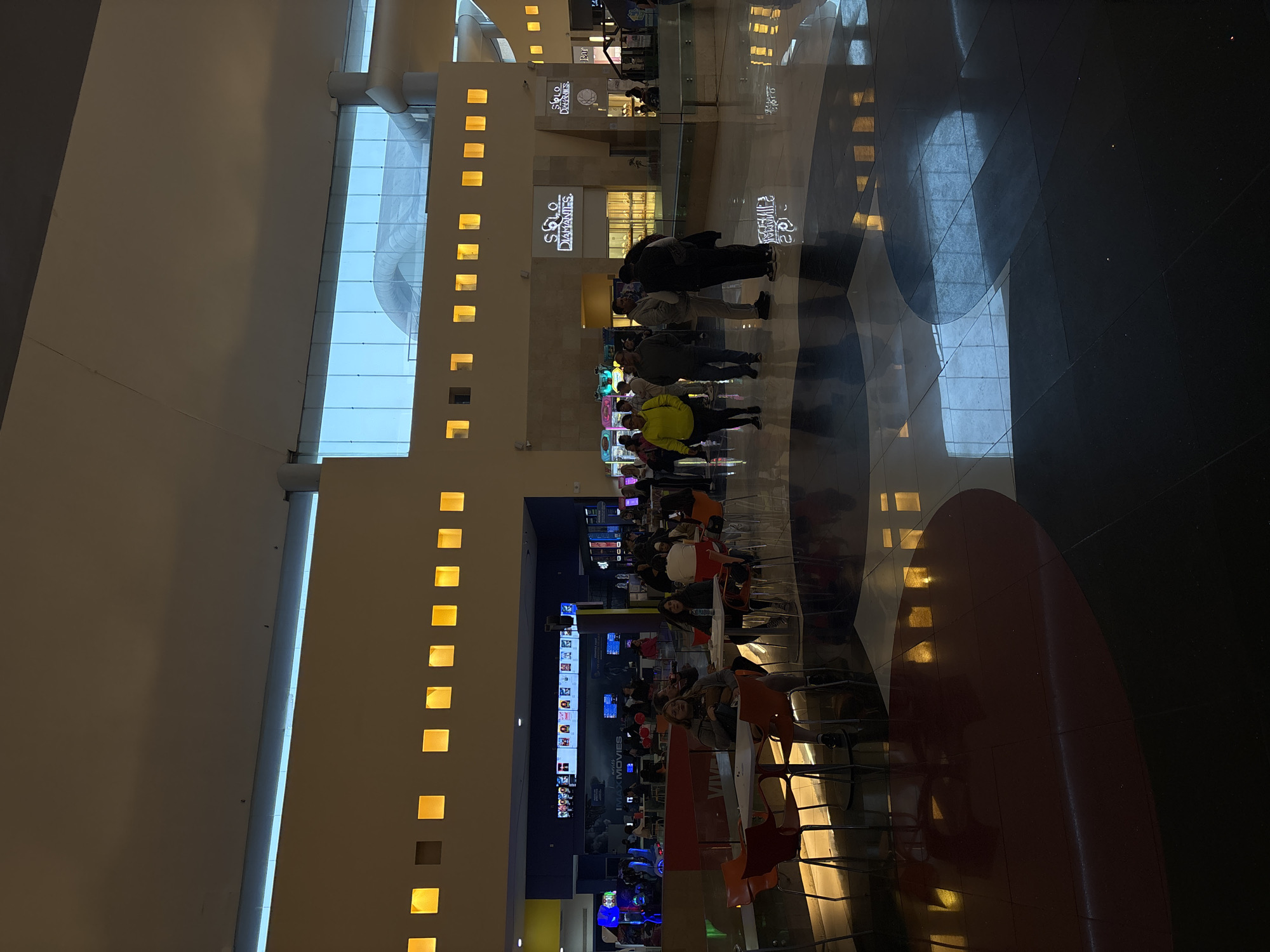 n interior view of what appears to be a shopping mall food court in Puebla, Mexico. A row of businesses is visible, including a “Solo Diamantes” store. Several people are walking in the central area, and others are seated at tables, seemingly eating or resting. The mall has a high ceiling with rows of small, square windows lining the walls, emitting a warm, yellow light. The floor is a glossy black surface with patterned circular designs in lighter shades.