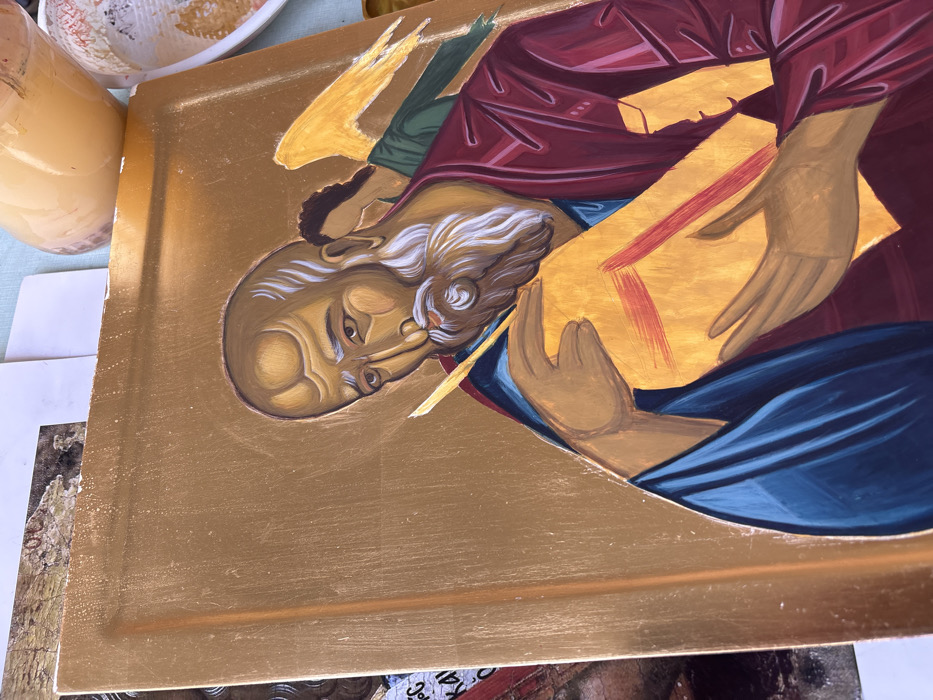 This image captures an Orthodox Christian icon in an artistic workspace in Tryavna, Bulgaria