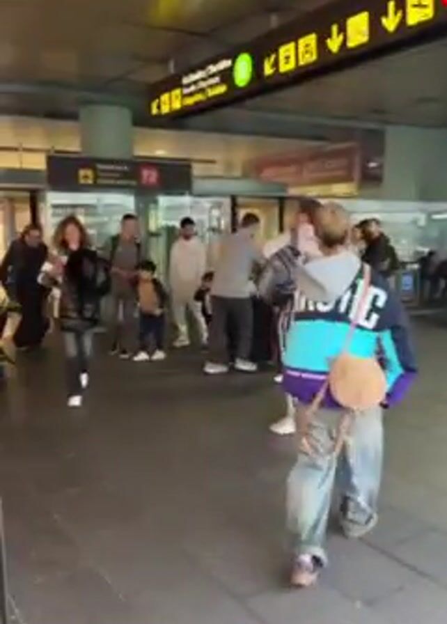 bustling indoor public space, likely a transit station or airport terminal, with numerous people moving and stationary. The camera follows a person from behind, wearing a teal and purple jacket and carrying a tan-colored bag. People are seen carrying luggage, sitting on the floor, and walking in various directions. Overhead signs indicate directions, one marked "A". The flooring is tiled. The lighting is a mix of natural and artificial, creating a somewhat shadowed atmosphere. The scene conveys a sense of activity and transit.