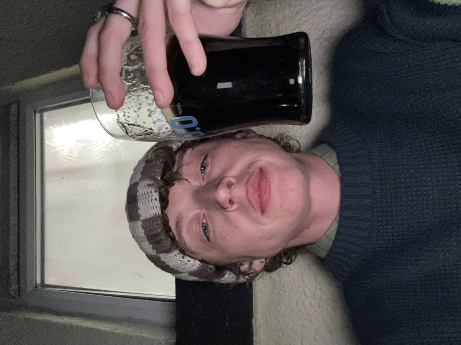 A person wearing a brown and white checkered beanie and dark teal sweater holds a glass of dark beer. The person is fair-skinned with curly hair peeking out from under the hat. They have blue eyes, a nose ring, and a small piercing on their forehead. A window with a pale light is visible behind the person. The person's hand holding the glass has two rings on their fingers.
