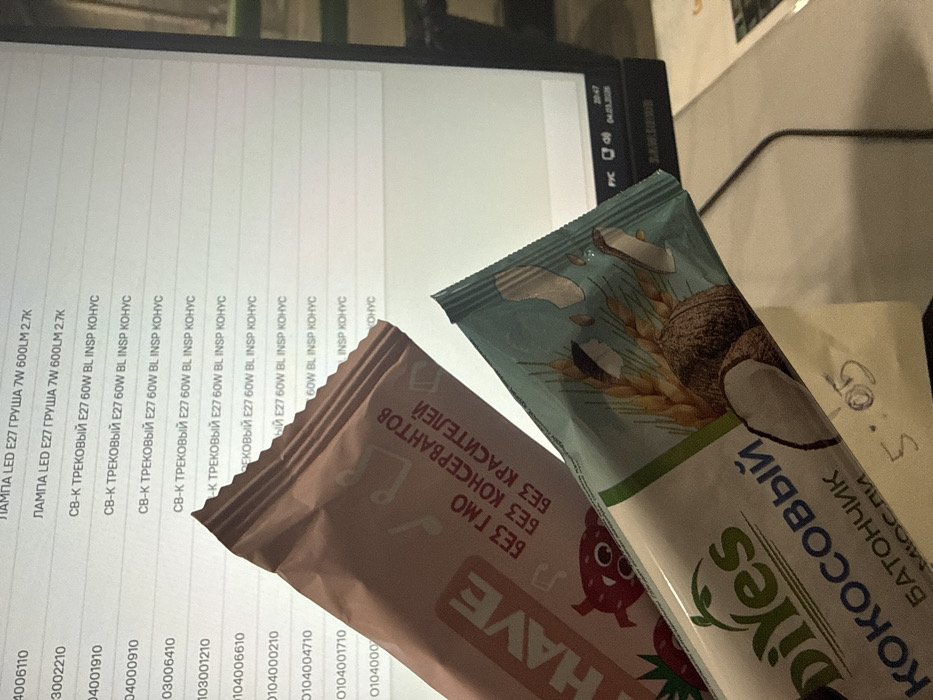 In Lupanovo, Russia, a close-up image captures two packaged food bars held in the foreground, partially obscuring a computer monitor