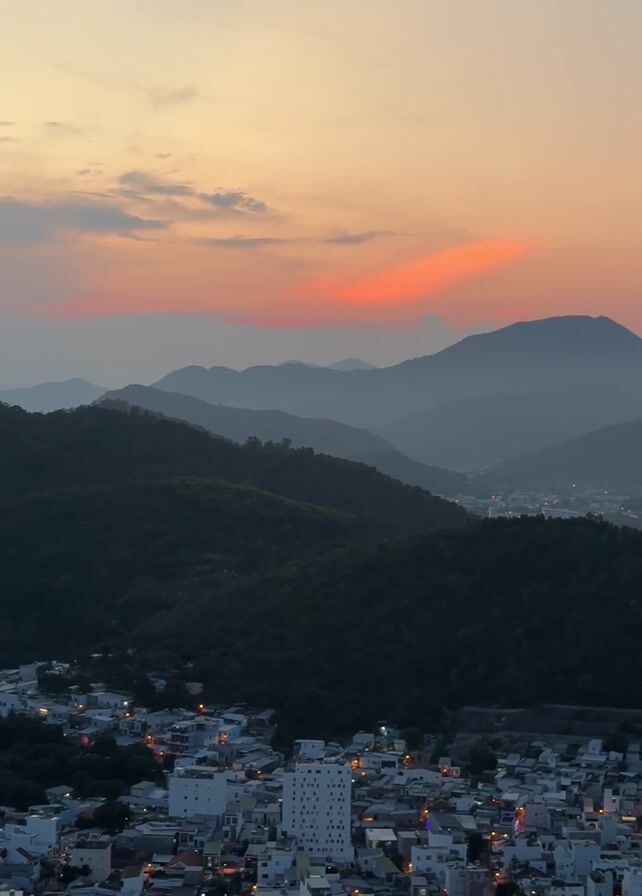 city with buildings silhouetted against a sunset sky. In the background, there are layers of green hills and mountains. The sky is a mix of orange, pink, and gray, with a few clouds scattered across it. The city is nestled in the foreground, with streetlights starting to illuminate the buildings.