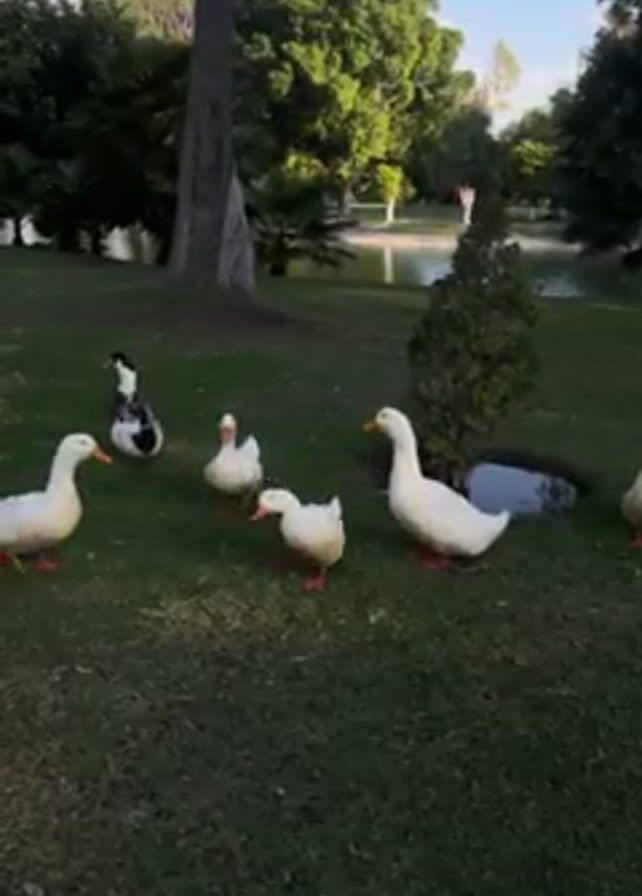 group of ducks standing and walking on green grass. There are about seven ducks visible, most are white, with orange beaks and feet. One duck has black and white markings. The ducks are in a park-like setting with green trees and a pond in the background. The sky is partly cloudy. Some of the ducks are vocalizing and making quacking noises.