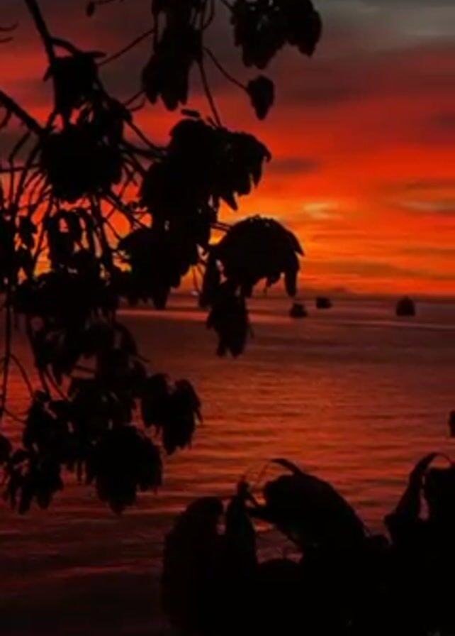 silhouette of tree branches and leaves against a vibrant sunset over water. The sky is a mix of red, orange and a bit of grey near the top. The water reflects the orange and red hues of the sky, creating a shimmering effect. There are a few faint objects in the distance on the water, possibly boats.