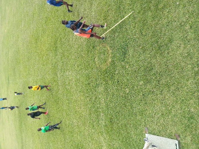 A group of athletes are spread across a green grassy field. Most are lying down. One individual in an orange shirt is standing next to another in a blue shirt. A yellow measuring stick is on the ground nearby. There are several other people further off in the distance, all lying on the grass wearing different colored tops. The ground appears to be manicured well.