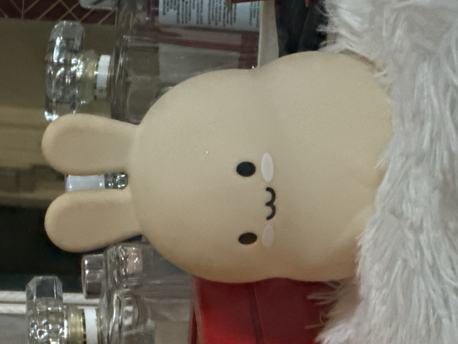 The image displays a static, close-up view of a light-yellow, cartoon-style bunny figure, positioned centrally, resting on a white, fluffy surface