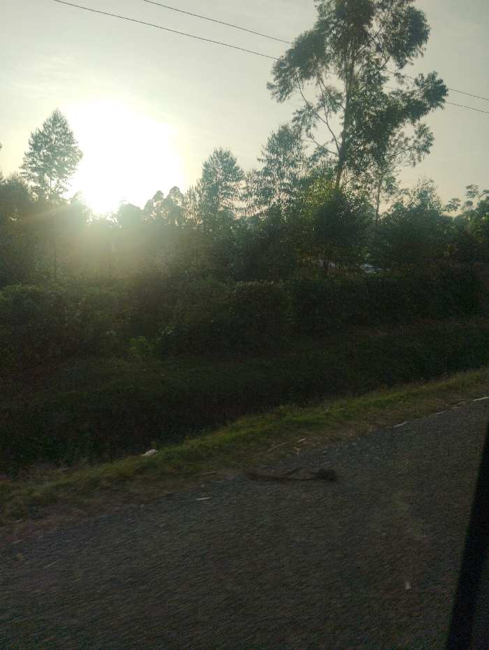 A landscape photograph captures a sunlit grove. Tall trees and dense bushes fill the midground, partially obscuring the bright sun. In the foreground, a paved road with patches of grass on the side is visible. An unidentifiable object lies on the road's surface. Overhead, power lines cut across the sky, emphasizing the rural scene's blend of nature and infrastructure.