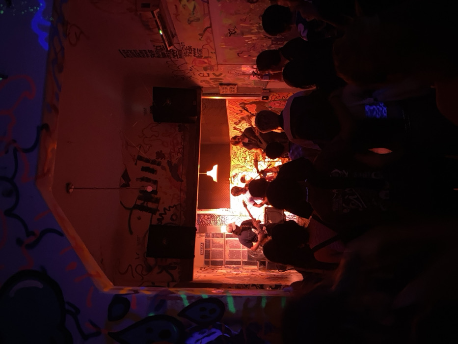 A blurry image depicts a band performing live in a small venue. The band is illuminated by stage lighting, with silhouettes of a crowd watching. Walls are covered in graffiti and the room is darkly lit. A speaker is visible on the left-hand wall. The viewpoint is high, suggesting the photo was taken from an elevated position.