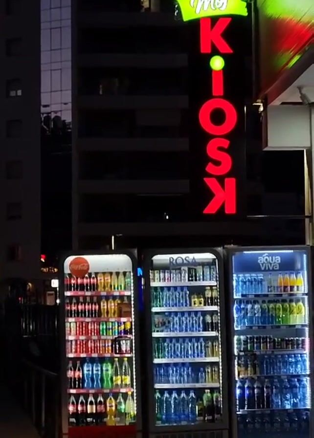 The scene depicts three illuminated vending refrigerators outdoors, likely at night. The refrigerators, branded with Coca-Cola, Rosa, and Aqua Viva logos, are fully stocked with beverages. Above them, a neon sign reads "Moj KIOSK" in red. The background features a tall, modern building with visible windows. The scene appears to be in an urban setting, possibly a street or plaza, though the immediate foreground is limited to the sidewalk area where the refrigerators are placed.