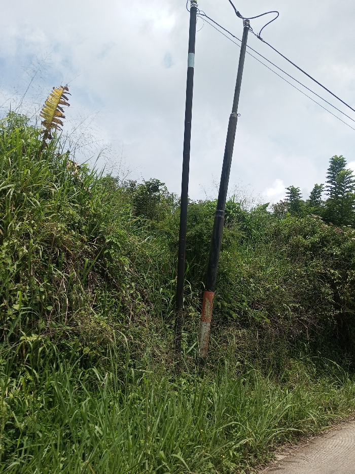 The scene depicts an outdoor environment in Vieng Phouka, Laos, under a cloudy sky. Two dark utility poles are positioned off-center to the right. The left pole features a light blue band near its apex, while the right pole exhibits a faded orange and white marking on its lower section. Overhead utility lines span between the poles and extend beyond the frame. Lush, green vegetation, consisting of tall grasses and dense foliage, covers the foreground, a prominent bank on the left, and the background. A distinctive, vertically elongated, yellowed plant structure is visible on the upper left side of the vegetation bank. A segment of a paved road or pathway is present at the lower right corner. No individuals or discernible activities are depicted.