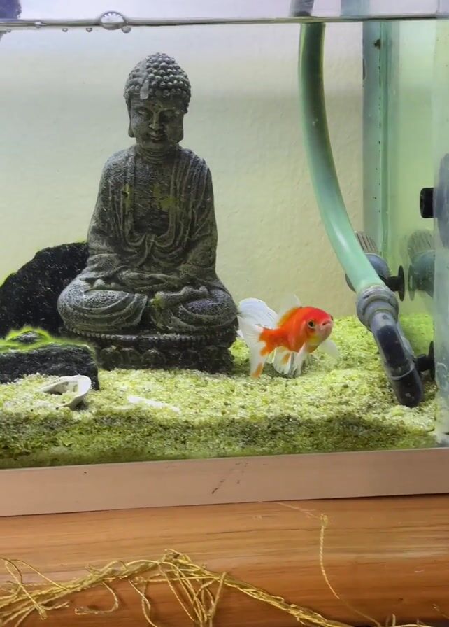 small aquarium with a single orange and white goldfish swimming inside. The tank contains gravel that appears to have algae growing on it, along with decorative elements including a small Buddha statue, artificial rocks and plants, and several small seashells. An aeration tube and filter are visible in the upper corners of the tank. The aquarium sits on a wooden surface where some stringy material is present.