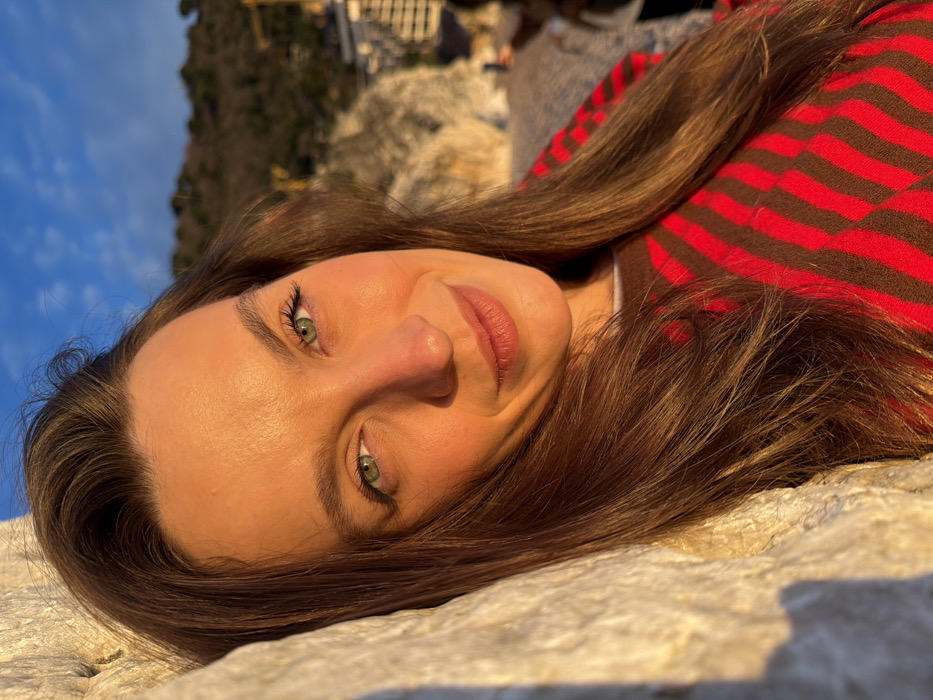 A woman lies on a stone surface, gazing upward. Her brown hair cascades around her face. She has fair skin and green eyes. She wears a red and brown striped shirt or sweater. In the background, a hillside with trees and buildings is visible, along with a patch of blue sky. The lighting suggests it is daytime, possibly late afternoon, with warm light casting shadows on her face and the stone. The image is taken from a slightly rotated perspective.