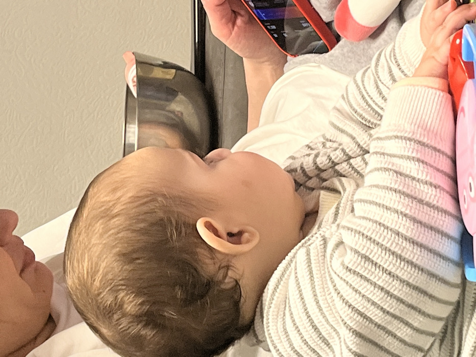 A baby with fair skin and light brown hair lies on a white surface, possibly a bed. They wear a striped white and gray sweater. An adult holds a red smartphone above them. The baby gazes towards a shiny, metallic object, potentially a lamp or appliance, in the background. Other items such as a plush toy and brightly colored baby toy are also present.