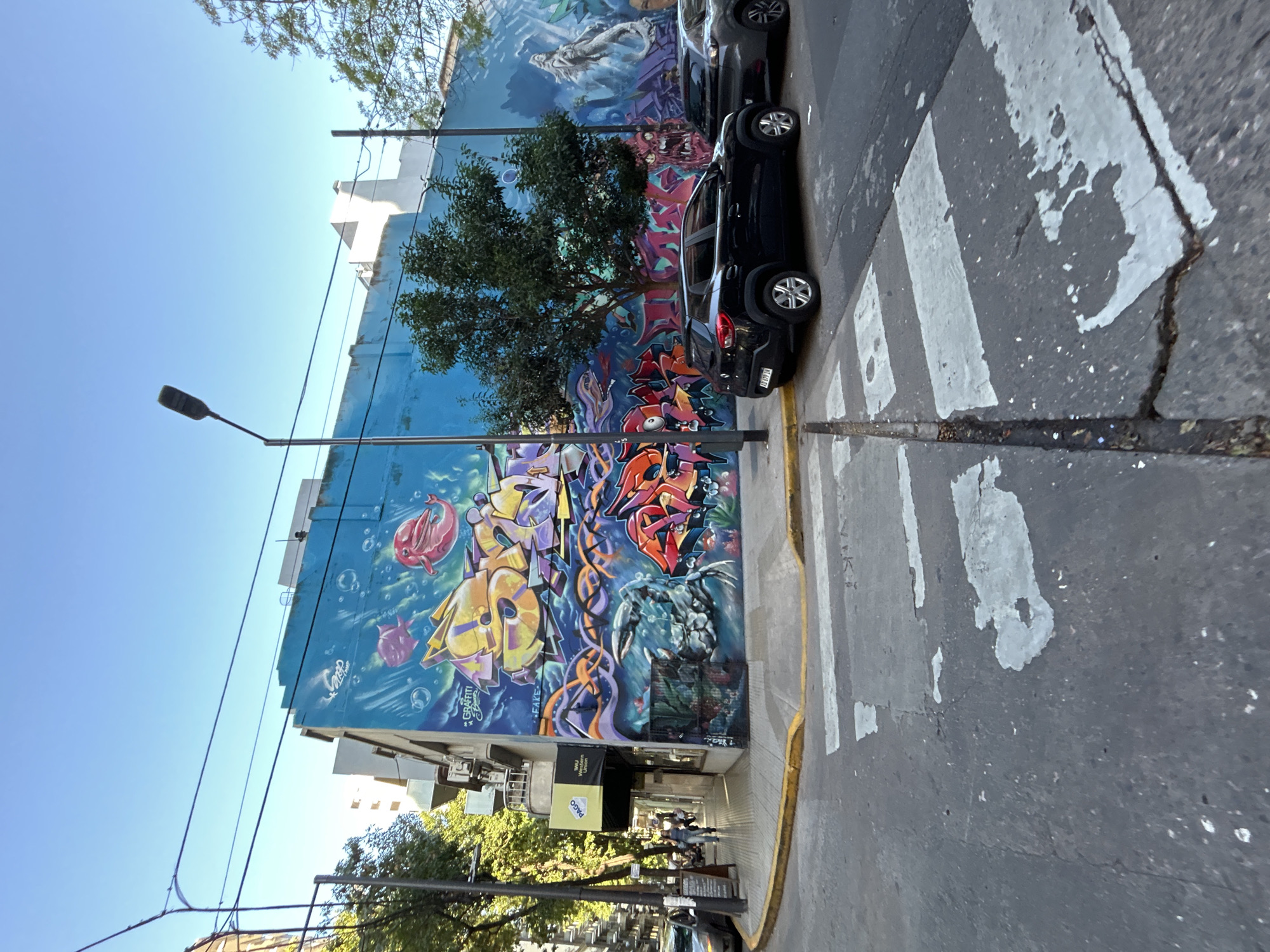 An urban street corner in Buenos Aires, Argentina, is depicted under a clear blue sky. A multi-story building, centrally positioned, features an extensive and vibrant mural covering its entire visible facade. The mural portrays an underwater scene with various marine life, including stylized yellow and purple fish, a red octopus-like creature, and a gray crab. Abstract elements like bubbles and swirling patterns are present. Text within the mural includes "GRAFFITI" and "FAKE." Further right on the building, another section of the mural shows a siren or mermaid figure. On the ground floor of the building's left side, a commercial establishment with a yellow and black awning displays "PAGO" and "Western Union." The street in the foreground is asphalt, exhibiting cracks and wear, and is marked with a faded white pedestrian crosswalk. Yellow-painted curbs border the concrete sidewalks. A black SUV (license plate AD 479 TN) is parked parallel to the curb on the street directly in front of the mural, followed by a partially visible dark-colored vehicle. A medium-sized tree with green foliage stands on the sidewalk, partially obscuring the mural. On the far left, two individuals are seen walking on the sidewalk. Overhead, multiple utility lines traverse the frame, and a black streetlamp post rises from the street near the center. Additional trees line the street on the left.