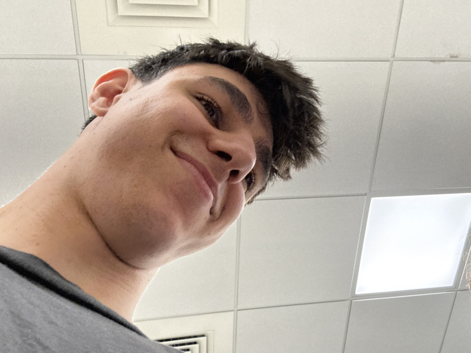 A low-angle photograph depicts the inverted face of a young adult male, appearing to look downwards toward the camera. The male has short, dark, textured hair, dark eyes, and prominent eyebrows, with a slight smile or smirk visible. A grey garment is partially visible on the left side of the frame. The background consists of a white suspended ceiling composed of square tiles, featuring a rectangular air vent in the upper left and two recessed square light fixtures with frosted diffusers; one is visible in the lower left-center, and the other is partially visible in the upper right. The environment is an interior space with artificial lighting. The specific location within Rehovot, Israel, is not discernible from the visual content.