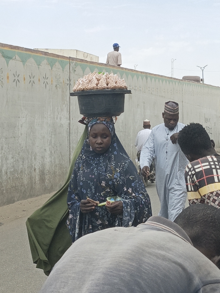 The image depicts a street scene in Fagge C, Nigeria, under an overcast sky. In the foreground, a dark-complexioned woman, wearing a dark blue floral-patterned hijab and a green garment draped over her left shoulder, carries a large black basin filled with numerous light-colored, pyramidal food items on her head. She holds small, light-colored items, possibly currency or wrappers, in her hands, looking downwards. To her right and slightly behind her, a man in a light blue traditional kaftan and a patterned brown and white cap stands, wearing a dark rosary or prayer beads. He is also looking downwards. Partially visible in the lower right foreground, a person with dark hair wears a brown, black, and white plaid shirt, facing away from the camera with their head bowed. Another person's light gray polo shirt with a dark collar stripe is visible in the extreme lower foreground, also facing away. Further in the background, another man in a white traditional garment and cap stands near what appears to be a motorcycle. Dominating the mid-ground is a high, light gray concrete wall adorned with a decorative green and white scalloped and floral pattern along its top edge. On the top of this wall, a man in a light-colored shirt and a blue baseball cap is visible, facing away from the camera. The ground appears to be an unpaved or lightly paved surface.