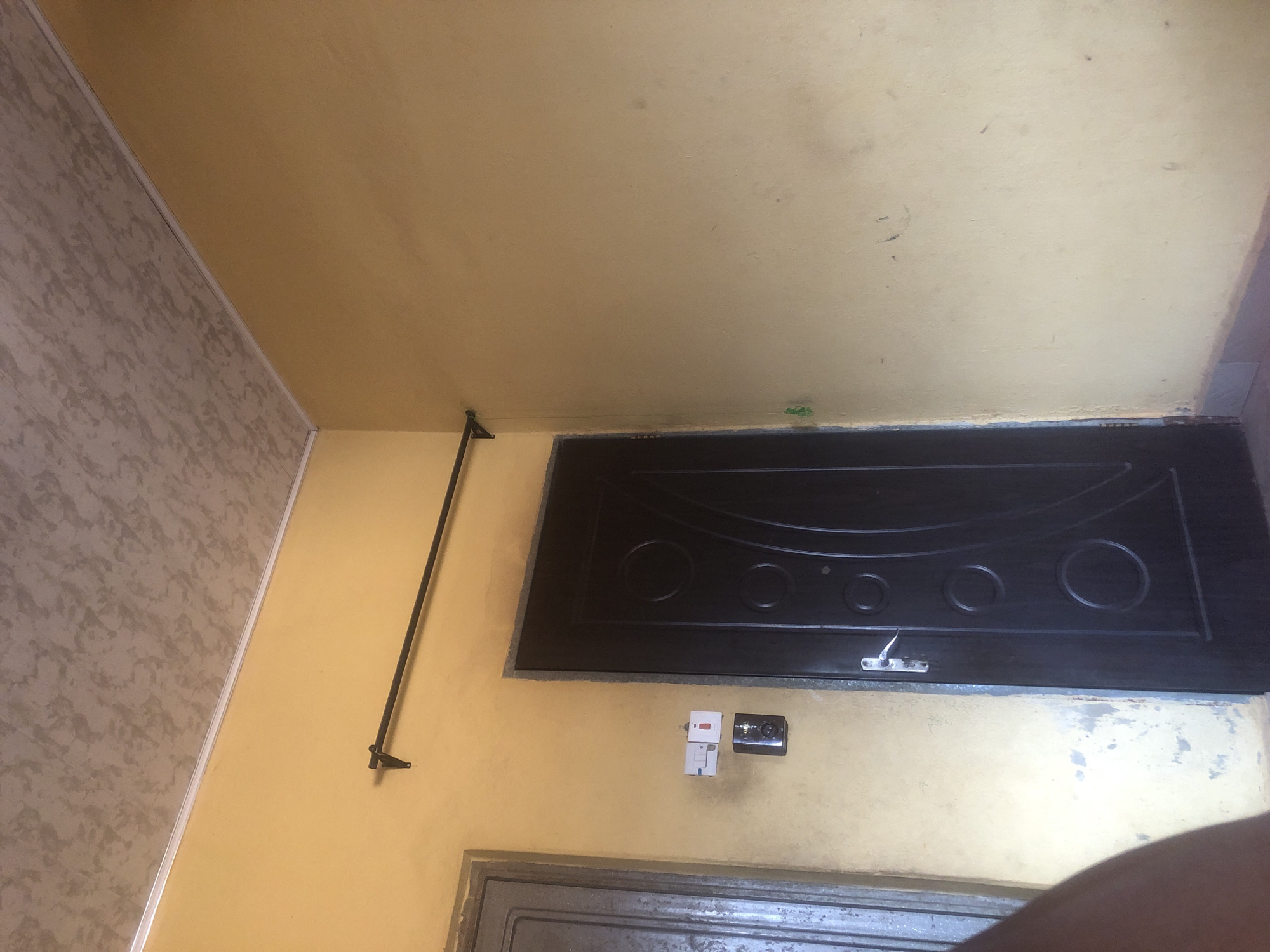 This image depicts an interior corner of a room located in Rido, Nigeria. The walls are painted a light yellow-ochre color, exhibiting some minor scuffs and marks. The ceiling features a grey, mottled texture with a white trim molding along the top edge of the walls. In the center of the frame, a dark brown or black panel door is visible. This door has three distinct circular indentations in a vertical alignment on its surface and is fitted with a silver-colored lever handle and escutcheon. To the left of this door, a partial view of a second door or door frame, appearing grey and possibly metallic or with a corrugated texture, is present. Mounted on the yellow wall between the two doors are electrical fixtures. These include two vertically aligned white rectangular modules; the upper one appears to be a double switch or outlet, and the lower one contains a red component. Below these, a black wall-mounted device with the branding "ORGA" is affixed. Above the central dark door, a black metal curtain rod is horizontally mounted on the wall using two visible brackets. The floor is partially visible at the bottom of the frame, showing a reddish-brown base with a lighter, possibly tiled, border. No individuals are present in the scene, and no specific actions or interactions are depicted.