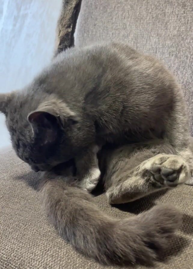 A gray cat is seated on a gray, textured couch, licking its tail