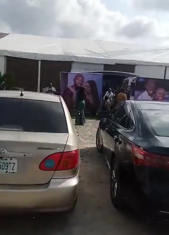 The scene is outdoors, with a white tent structure visible in the background. Several people are walking towards the tent. A large banner with pictures of a couple is attached to the tent. In the foreground, two cars are parked. The first car is a gold Toyota Corolla CE with a license plate that reads "BWR-509TZ." The second car, parked next to it, is black. A cell tower is visible in the background. The sky is cloudy. The video was taken using a Tecno Spark 9T phone.